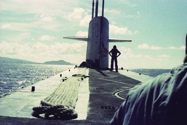 These shots were taken by EM3 Barnett (a.k.a. EMC Barnett retired) prior to pulling in at PH at the end of Patrol 54 (circa 1980). We were waiting for a slow target to get out of our way in the channel so we did slow circles in front of Waikiki to entertain the tourists. You are looking at the last shot of the SSBN we knew and (loved?). 2 weeks later, she was dubbed an SSN.